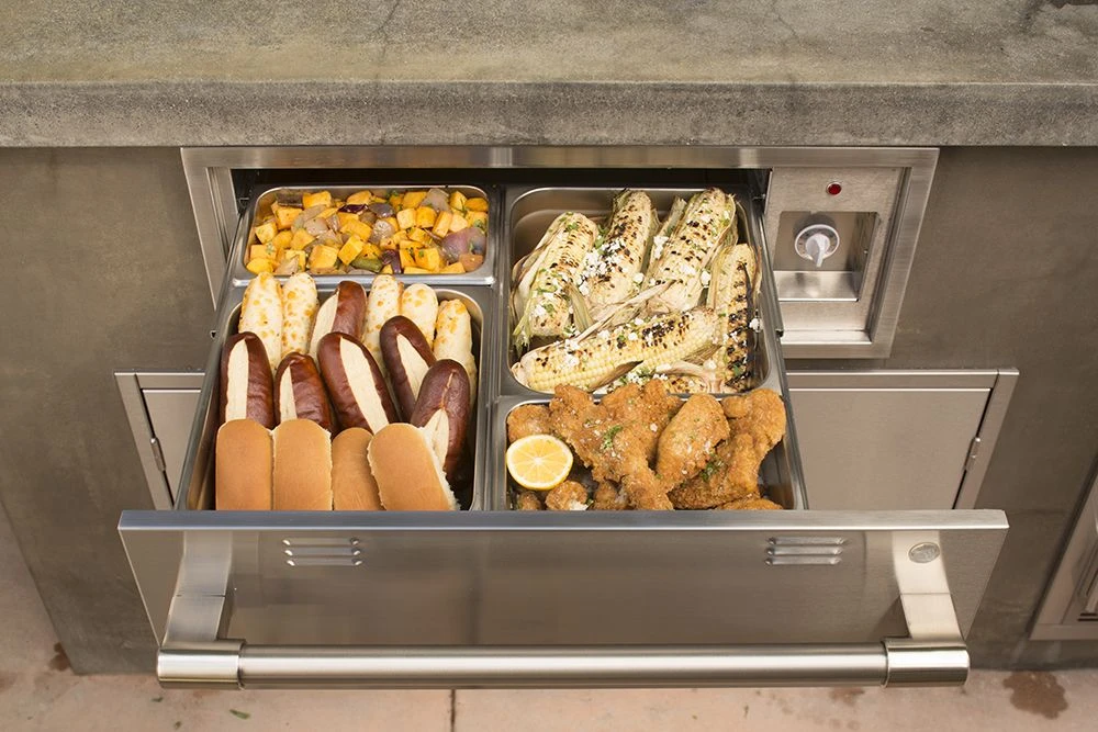 Alfresco AXEWD-30 Electric Warming Drawer, 30-Inch provides a premium addition to your outdoor kitchen. The 30-inch all stainless steel warming drawer features electronic temperature control. It includes four removable food pans with matching lids. The warming drawer doubles as a plate heating system prior to serving meals. Upgrade your outdoor kitchen with help from Alfresco!