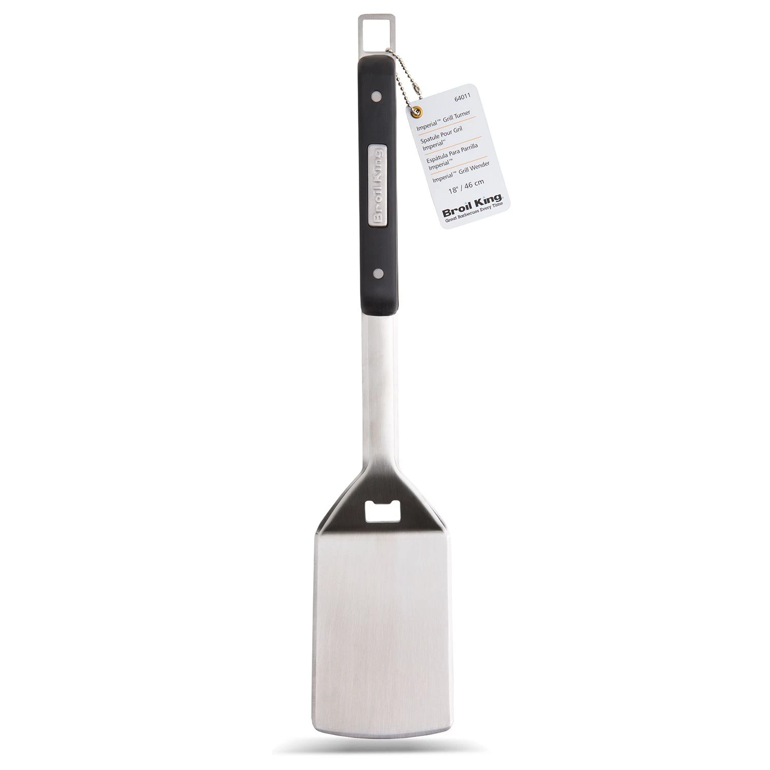 Broil King 64011 Stainless Steel Grill Turner offers a premium accessory for use with your grill. The Broil King Imperial turner features high grade 1.8 mm stainless steel construction and a high density resin handle for ultimate durability. An integrated bottle opener offers added convenience, while a hanging hook makes it easy to hang your tool when not in use.