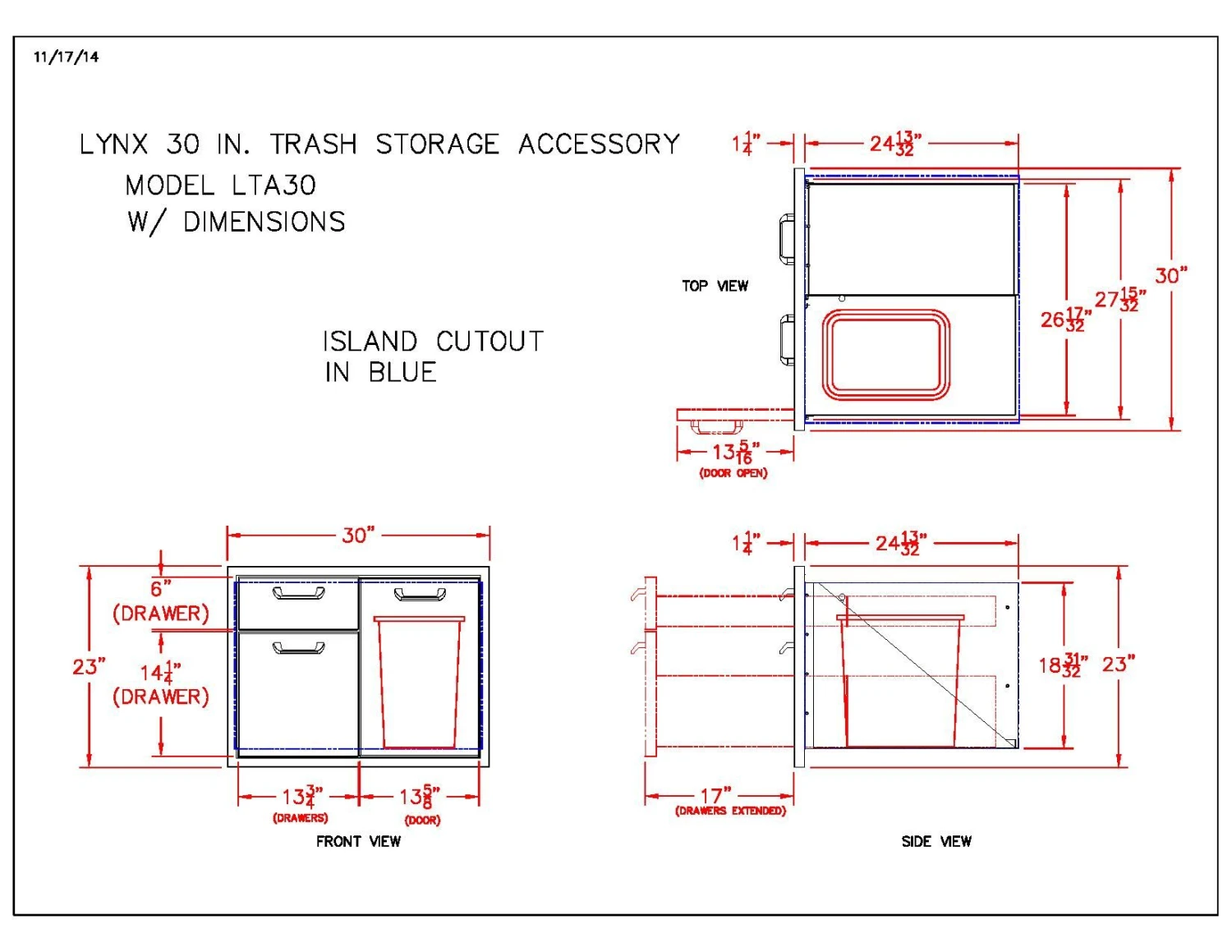 Lynx LTA30 Professional Trash Drawers Combo Unit, 30×23-Inch provides a high quality outdoor kitchen component to complete your ultimate outdoor BBQ paradise. This unit features a heavy 16-gauge 304 stainless steel construction with smooth welded joints for a blend of style and durability that will stand up to the elements in any climate. The slide out drawer features railings designed to conceal two normal sized trash or recycling receptacles in order to provide a stylish way to hide your waste disposal. The entire line of Lynx Professional outdoor kitchen equipment features the same polished stainless construction for a matching stylized look to transport your kitchen outdoors.