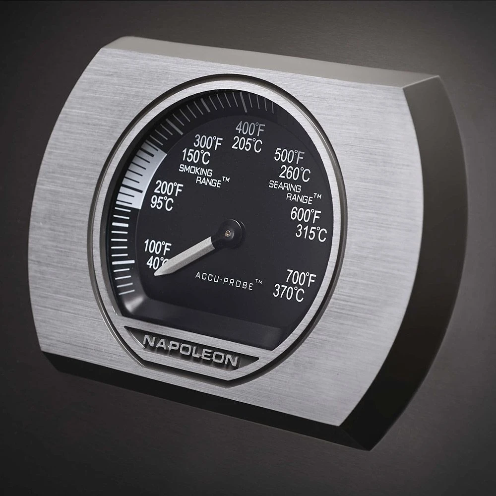 The patented “S” style wave grill grates are a signature of Napoleon grills and feature 7.5mm thick 304 stainless steel construction to provide long lasting durability and allow professional style grill marks. The unique Flame Throwing ignition provides a simple and reliable experience by shooting a flame to the burners, making start-up a breeze. The infrared back burner is rated for 18,000 BTU to allow professional style rotisserie cooking with the heavy duty rotisserie kit, and the infrared “Sizzle Zone” is rated for 14,000 BTU and can reach up to 1,800 degrees F to achieve steakhouse quality searing. The stainless steel side shelves feature integrated tool hooks for convenience and the (4) heavy duty casters allow easy mobility and lock to stay in place. Grillers will enjoy the Safety Glow LED back-lit control knobs that turn from blue to red while the burners are in use to make for a safe grilling experience.
