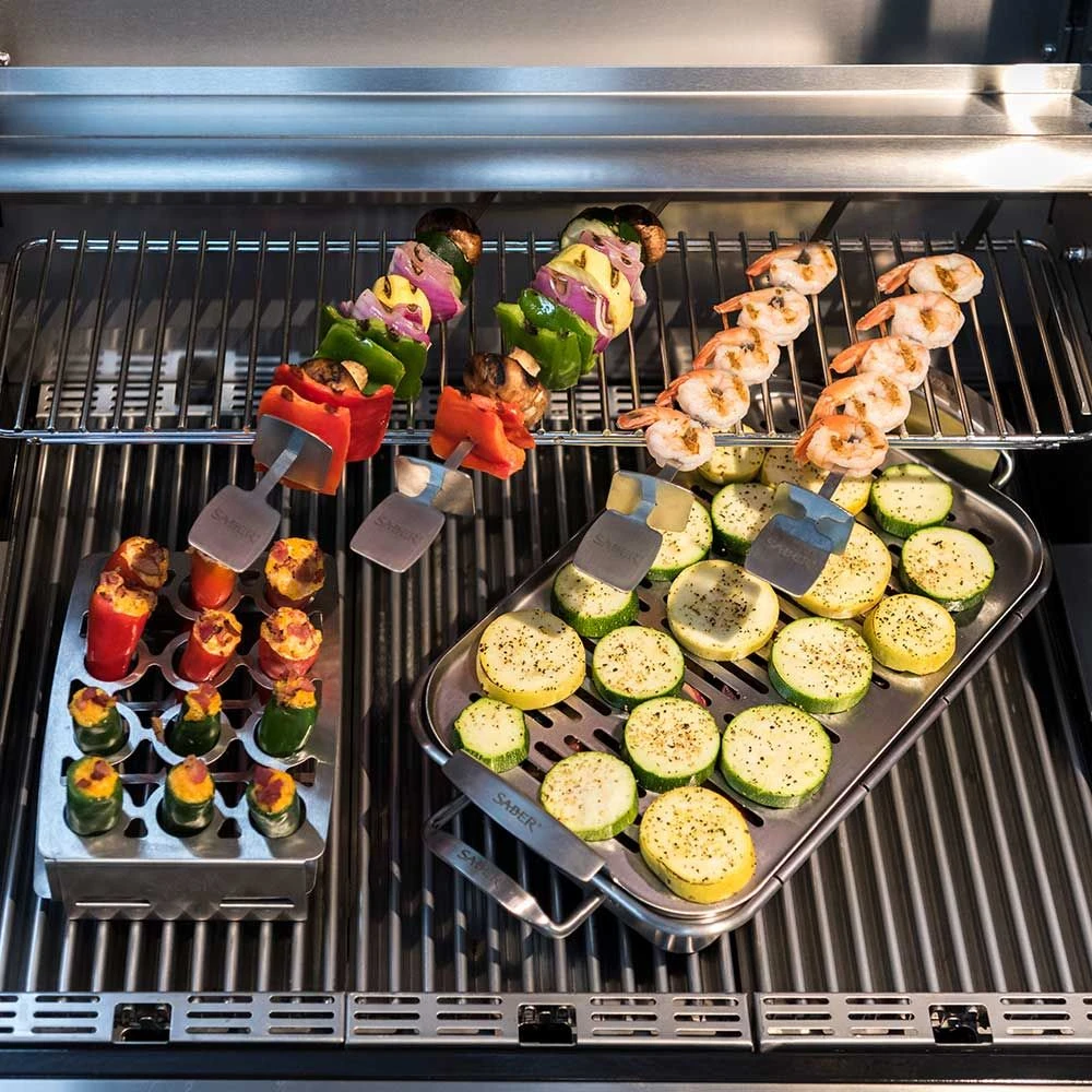 Saber A00AA7218 Stainless Steel Skewer Set with Sliders provides a premium accessory set for use with your grill. Featuring premium construction, these skewers with sliders keep food from rotating and moving along the tines. Make shrimp, vegetable, or chicken kebabs with ease and expand your cooking options. For even more versatility, combine the skewers with the Saber Roasting Pan (sold separately) and steam with wine or beer for more dynamic flavor.